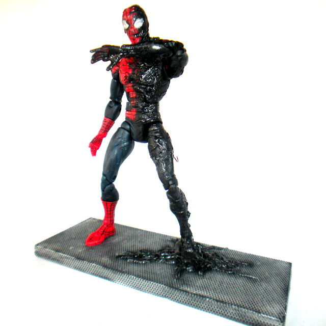 Sculpted symbiote testor on the left side of spiderman,p ainted black, with glossy finish. Dry brushed blue on the right leg and the arm.Make a base for spiderman, show that the symbiote climb up to spiderman.