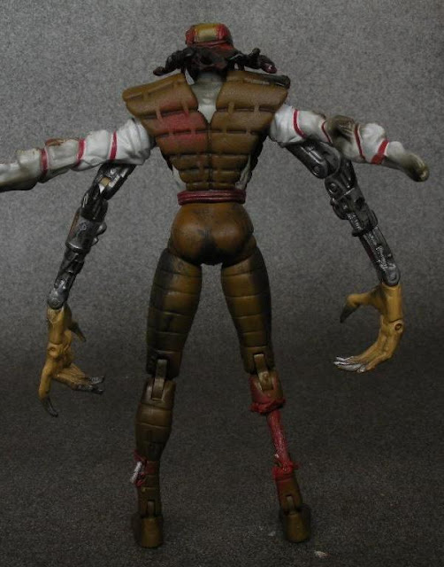 This is custom zombie Lady Deathstrike. Custom painted detail, silver bone because she had Adamantium skeleton. Sculpted zombie detail, bone sticking out. Painted white skin, and silver cyborg arm.
